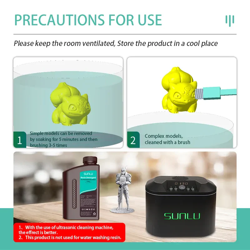 High Compatibility: Recommended Resin: Standard resin, Plant-based resin, ABS-like resin, Pa-like resin, High Toughness resin, High Temperature resin. SUNLU photosensitive 3D Printer Resin Model Detergent Cleaners are reusable, non-toxic.